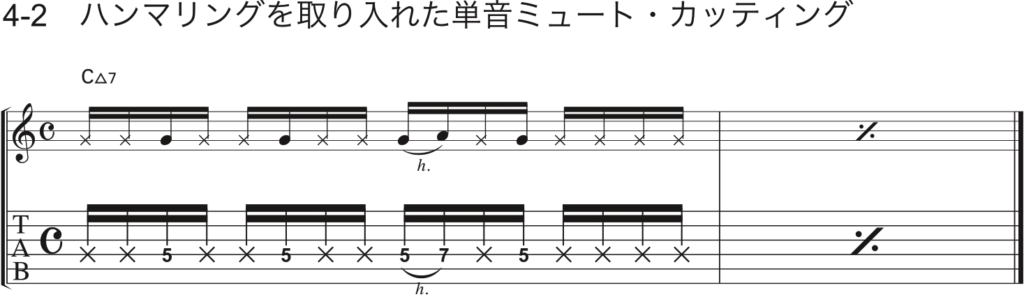 単音ミュートカッティングは、4弦をミュートしながらアタックを強調し、3拍目でハンマリングを加えることでリズムにアクセントを付けるテクニックです。