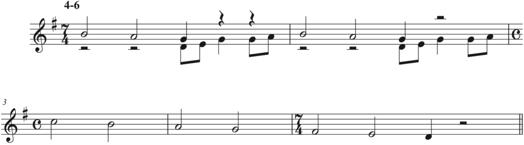 譜面上では7/4を2小節、4/4を2小節、再び7/4を1小節という順に配置します。