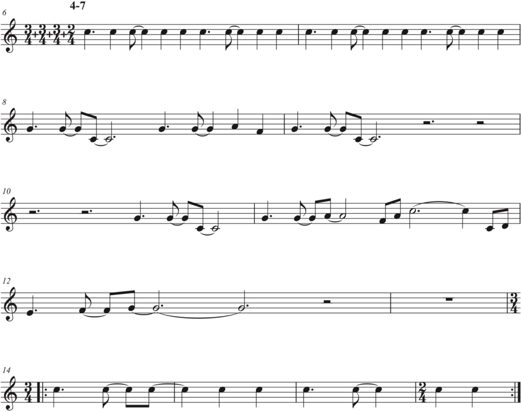 譜面上では 3拍+3拍+3拍+2拍 のまとまりが規則的に並びます。