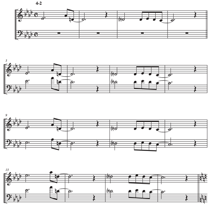 - キーA♭の4小節フレーズを例に移調すると、各楽器の音域に収まりやすい