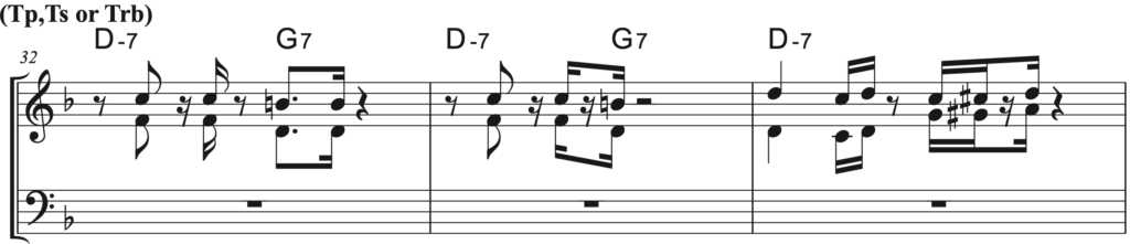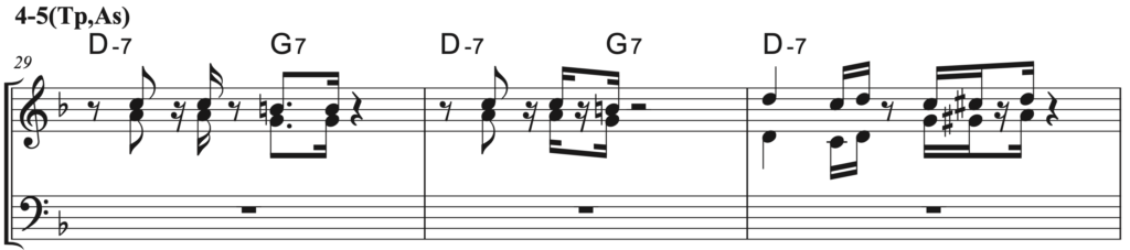 このフレーズは、上パートをトランペット、下パートをアルトサックスが吹く想定で書かれています。