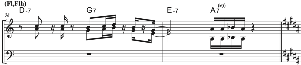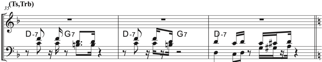 この段では、上のトップノートをテナーサックス、下のパートをトロンボーンに想定して書かれています。